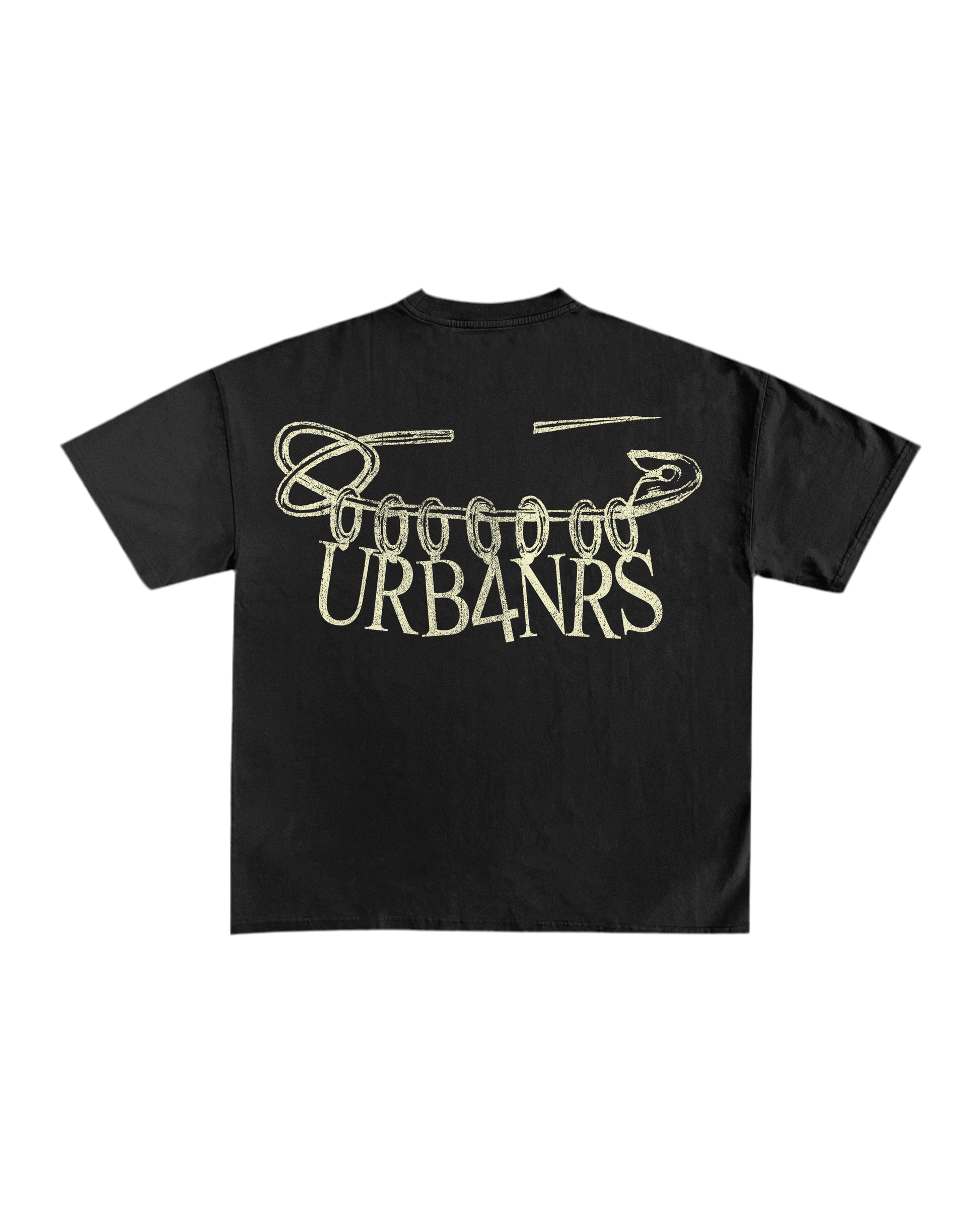 Black tee featuring the bold URB4NRS safety pin graphic across the chest.